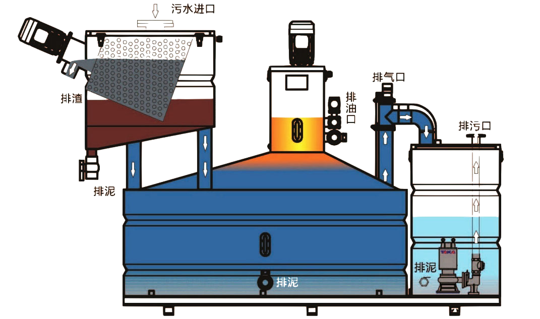 三級預(yù)沉淀:小顆粒物及污泥進行預(yù)先沉淀處理后,沉淀在預(yù)沉淀腔底部,可定期排放到渣桶中。