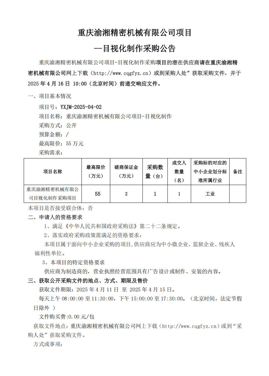 重慶渝湘精密機(jī)械有限公司項(xiàng)目 --目視化制作采購公告